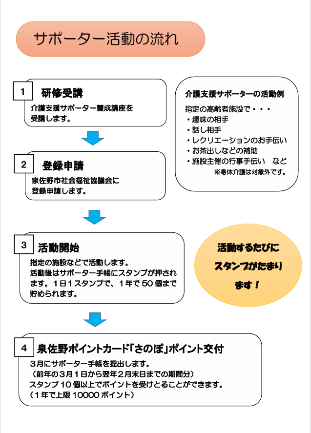 『認知症サポーター』とは、認知症を正しく理解し、認知症の人や家族を温かく見守り支える応援者です。自分や家族が認知症になった時、身近に認知症の人がいた時に、そっと見守る、そっと手助けをする人が、泉佐野市内に地域にたくさんいてくださることを目指して、「認知症サポーター養成講座」を随時開催しています。