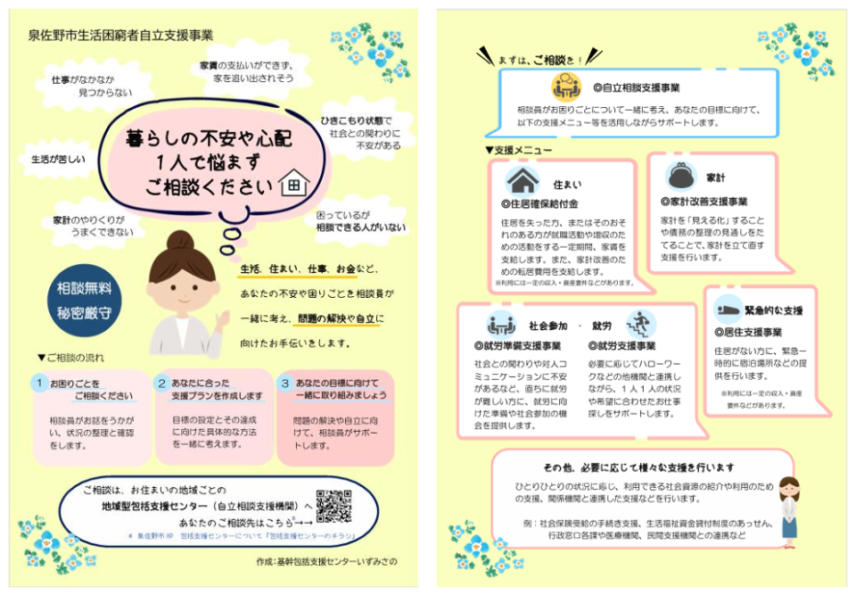基幹包括支援センターいずみさの・包括支援センターしんいけでは、「生活困窮者自立支援法」に基づき、生活に困窮されている方への各種支援事業を行っています。