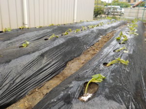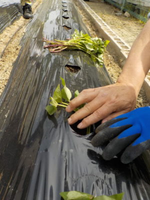 マルチに穴をあけて苗を寝かせるように植えます