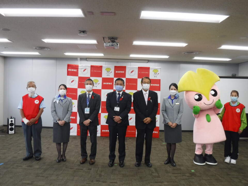 10月1日(金)には、オープニングイベントとして、関西国際空港にある航空会社北ビルにて、ANA関西空港株式会社様にご協力いただき、「空の第一便伝達式」を開催いたしました。ANAグループ様には、昭和37年から経営理念行動指針『社会と共に歩み続けます』に則った社会貢献活動として、赤い羽根共同募金のPRならびに募金運動にご協力いただいており、今年で60回目となりました。