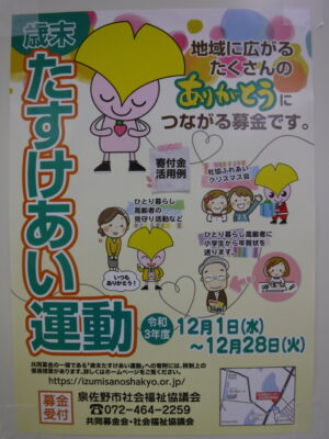 本日、12月1日(水)から、歳末助け合い運動がスタートしました。この運動は、共同募金運動の一環として行っている運動となります。