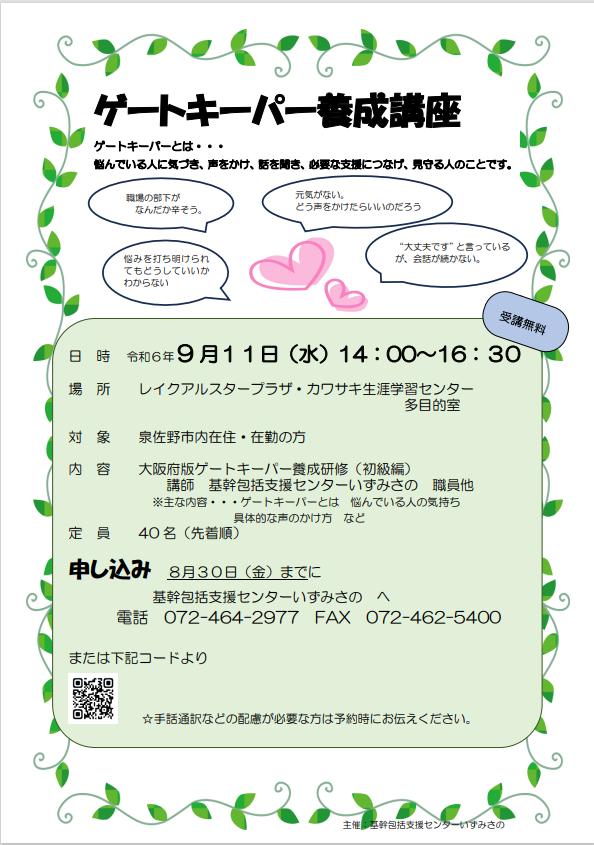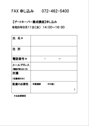 (「ゲートキーパー養成講座(9月11日)申し込み」と、氏名・電話番号・手話通訳の必要の有無等を書いて、FAXしていただいても大丈夫です。)