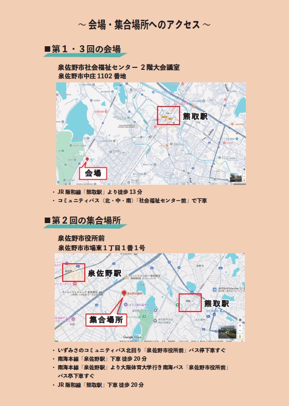 【場 所】 第1回・第3回:泉佐野市社会福祉センター2階大会議室(中庄1102番地)、第2回:泉佐野市役所前(集合場所)