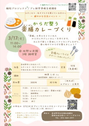 ひきこもり・生きづらさを感じている方を対象とした縁起プロジェクトとプレ就労準備支援講座の共催イベントとして、「からだ整う 薬膳カレーづくり」を開催します。